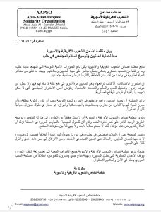 وفي ختام بيانها، دعت منظمة تضامن الشعوب الأفريقية الآسيوية جميع الأطراف المعنية إلى ضبط النفس، ووقف العمليات العسكرية التي تمس المدنيين، والعمل على تهيئة مناخ جاد ومسؤول للحوار والمفاوضات، بما يراعي المصالح العليا للشعب السوري وحقه المشروع في الأمن والسلام والاستقرار.