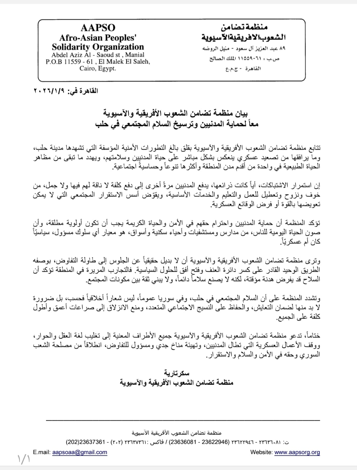 منظمة تضامن الشعوب الأفريقية الآسيوية تحذر من تداعيات التصعيد الأمني في حلب وتدعو لحماية المدنيين