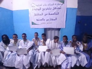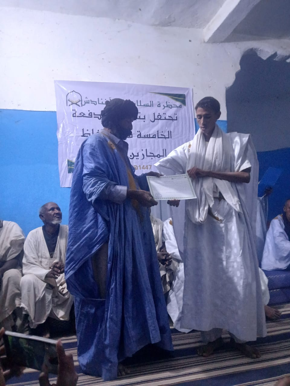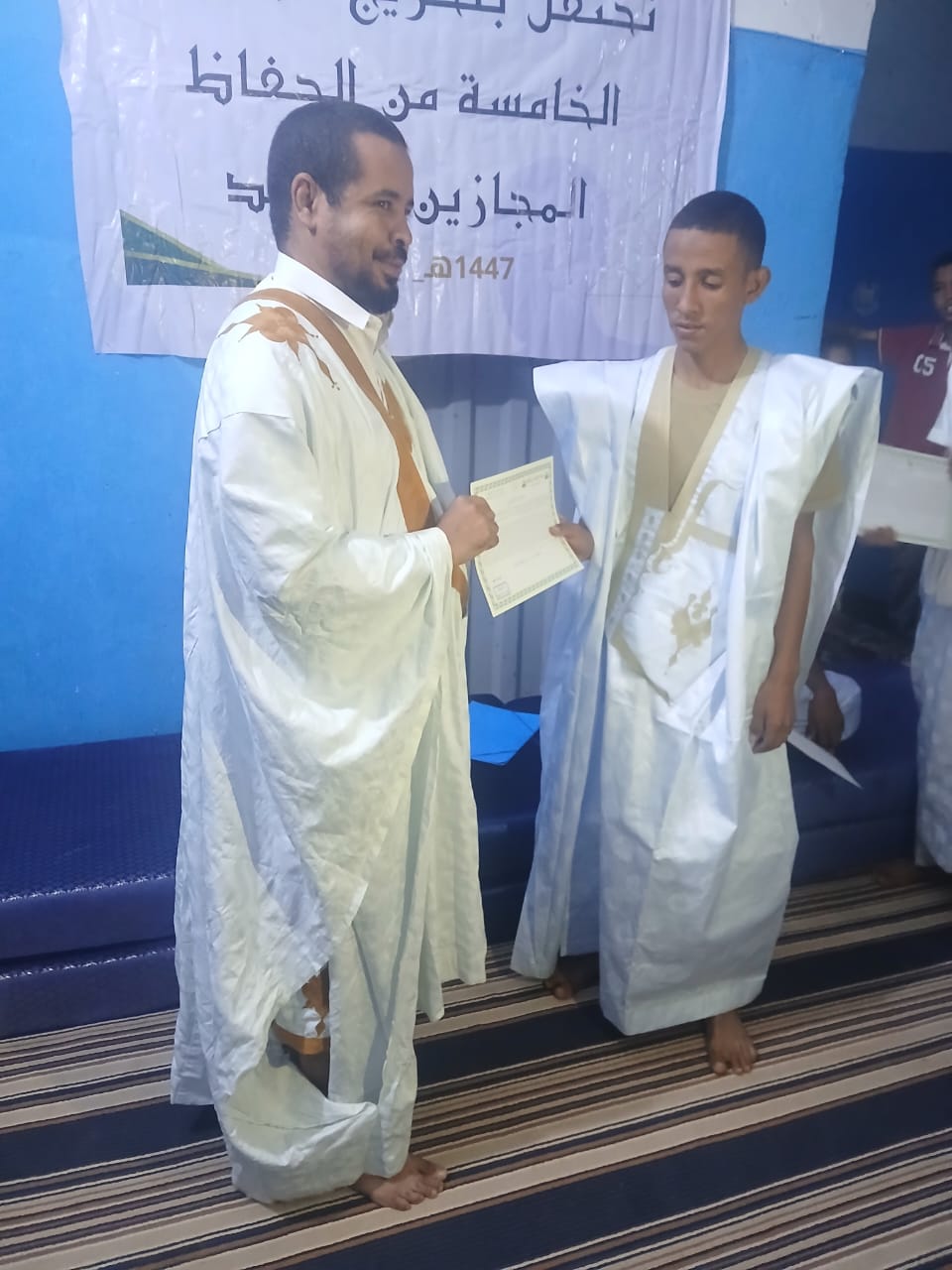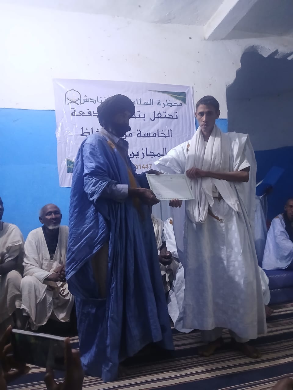 وجاء الحفل في أجواء إيمانية مفعمة بالخشوع والسكينة، حيث اصطف الخريجون بلباسهم التقليدي، وقد ختموا مسيرة سنوات من الجد والاجتهاد بحصولهم على الإجازة بالسند المتصل إلى رسول الله صلى الله عليه وسلم، في رواية معتمدة، بعد استظهار القرآن الكريم وضبط أحكامه وتجويده وفق أصول التلقي المعروفة في المحاظر الموريتانية.